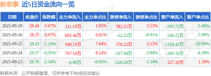 证券之星音讯,到2025年9月29日收盘,新宏泰(603016)报收于28.44元,上涨0.67%,换手率2.58%,成交量3.82万手,成交额1.08亿元。